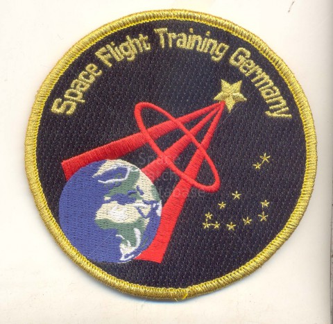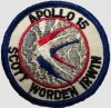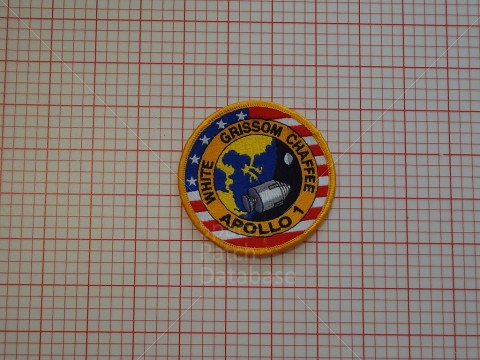 This patch, the seller claims, originated at the Marshall Space Flight Center. It is 4" in diameter and features a unique horizontal rib stitching on the moon's surface. Bare back. The "XV" is retained, in white thread, twill border which gives it a 4" feel).