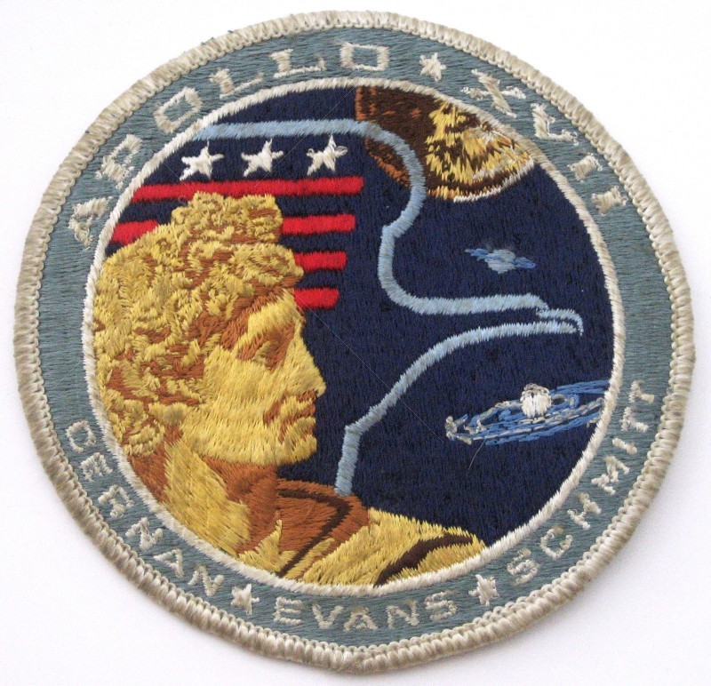 This version lacks the vertical stitching around the galaxy that is found in the vintage version of the A-B Emblem Apollo 17 patch.