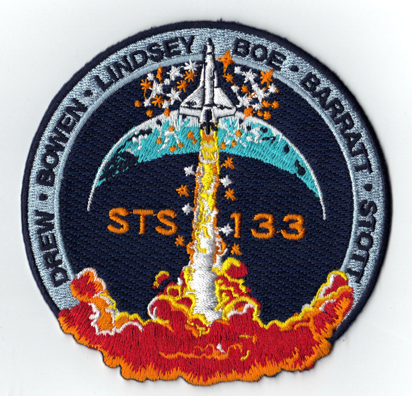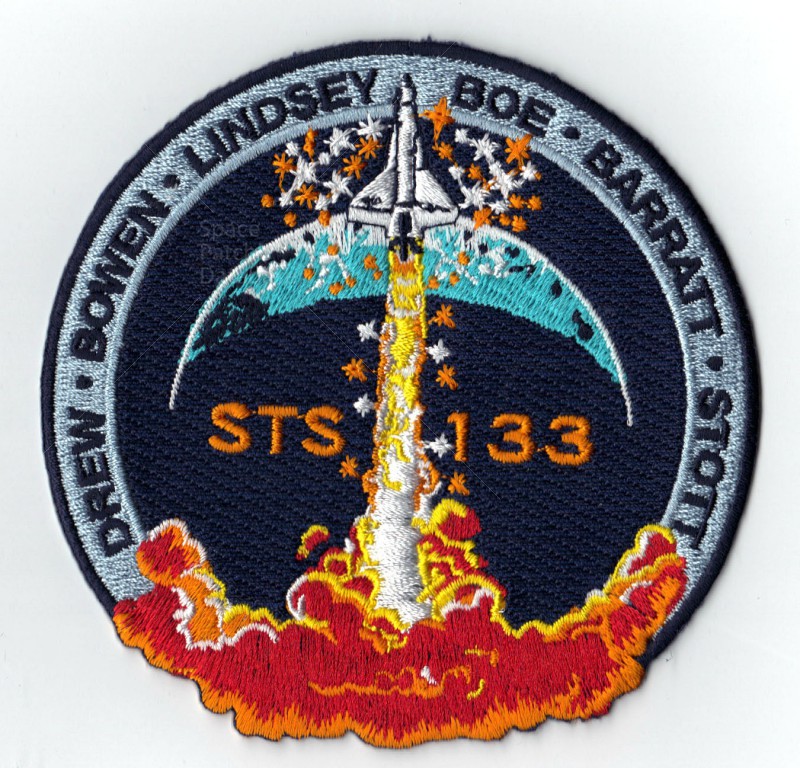 The STS-133 mission patch is based upon sketches from the late artist Robert McCall; they were the final creations of his long and prodigious career. In the foreground, a solitary orbiter ascends into a dark blue sky above a roiling fiery plume. A spray of stars surrounds the orbiter and a top lit crescent forms the background behind the ascent. The mission number, STS-133, is emblazoned on the patch center, and crewmembers' names are listed on a sky-blue border around the scene. The Shuttle Discovery is depicted ascending on a plume of flame as if it is just beginning a mission. However it is just the orbiter, without boosters or an external tank, as it would be at mission's end. This is to signify Discovery's completion of its operational life and the beginning of its new role as a symbol of NASA's and the nation's proud legacy in human spaceflight.]