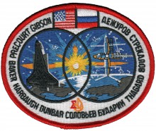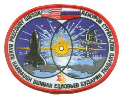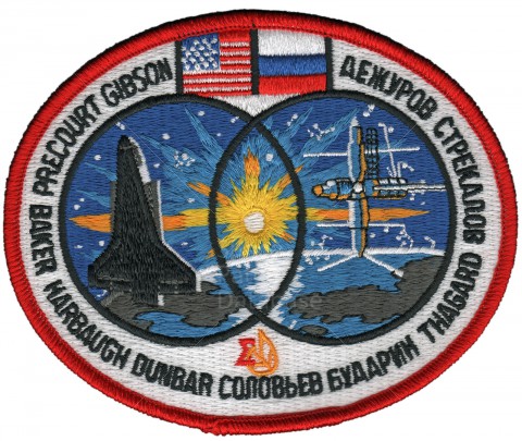 The official NASA patch for the Shuttle-Mir Program, showing a Space Shuttle Orbiter docked to the Russian Space Station Mir, flying above a stylised Earth. The patch is bordered by the colours of the flags of Russia and the USA