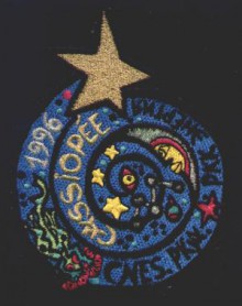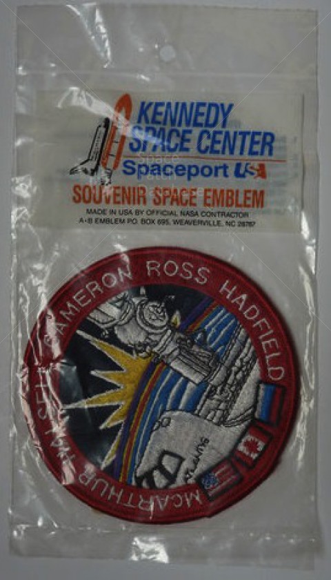 This is the A-B Emblem prototype version of the STS-76 patch. It has white thread instead of black for the Mir details and an extra set of solar arrays. The stars have a black shadow, but do not appear behind the yellow contrails like in the souvenir version.