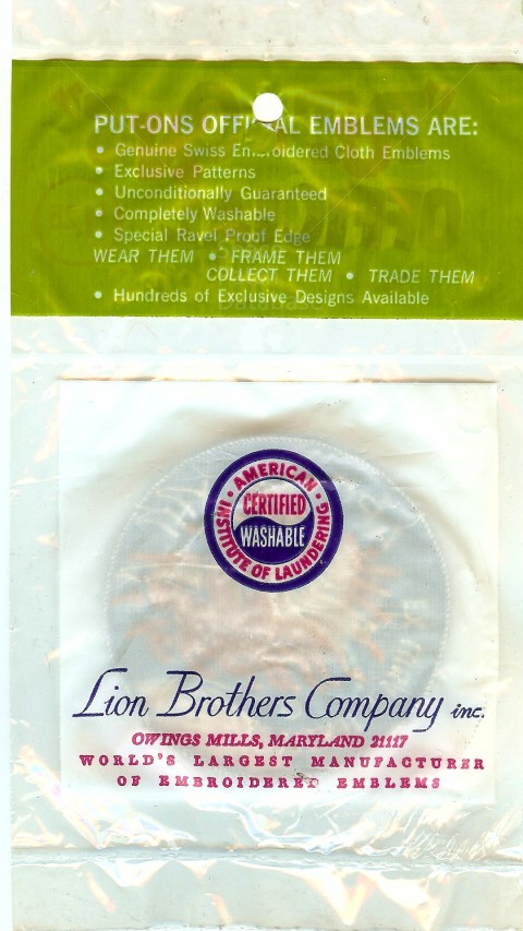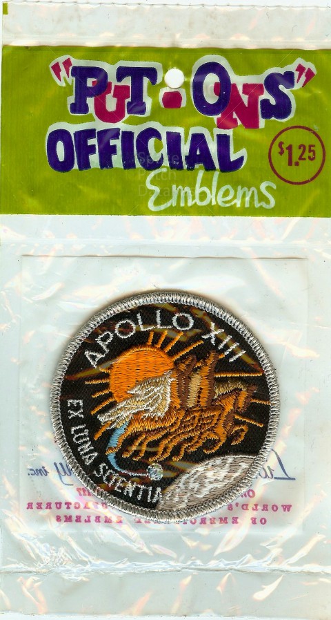 I have never seen this particular line of Lion Brothers' Apollo emblems before. Marketed under their "Put-Ons" emblems line, Lion Brothers produced these Apollo 11, Apollo 12, Apollo 13 and Apollo 14 patches. There may be others, but these are the only one's I have seen. Had these not been in their original packaging, they would probably have not been able to be associated with Lion Brothers.