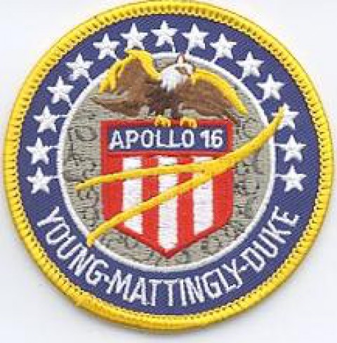 This edition of the Apollo 16 patch is 5" in diameter and was issued by Charlie Duke. His initials can be seen below the large crater on the right side.