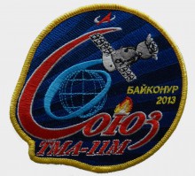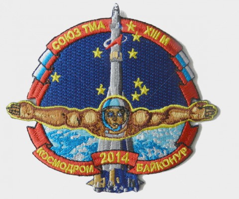 The Soyuz TMA-13M mission patch was designed by Luc van den Abeelen for TsPK/Spacepatches.nl and Roscosmos. The patch is centred around the main image of a famous Baikonur monument, known as 'the fisherman'. The cosmonaut is shown floating over a blue Earth, with a departing Soyuz launch vehicle climbing towards the stars. The constellation depicted is Cepheus; this is the callsign chosen by the spacecraft commander. Banners enclosing the scene show the spacecraft designation, crew names and their national flags.