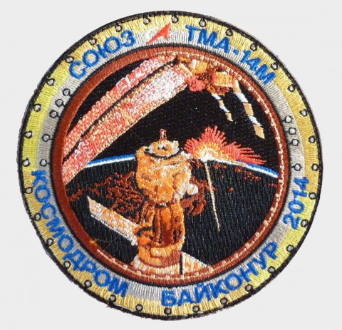 The Soyuz TMA-14M mission patch shows a porthole on the International Space Station, providing a view of the new spaceship coming in for docking. In the background, the rising sun announces dawn and a new expedition on the orbital research facility, expanding our knowledge and preparing for new destinations.