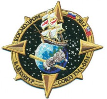 The insignia depicts the Earth, crowned by the Russian exploration ship Nadezhda, captained by Ivan Fedorovich Kruzenshtern on the first Russian round-the-world expedition from 1803 to 1806. "More than two centuries later, the Russian manned spacecraft Soyuz TMA-04M is in orbit around our home planet, on its way towards the International Space Station for continued exploration of space and on-orbit research," according to the emblem's official description. The patch is framed by a ring, inspired by a compass rose, indicating the four cardinal directions, and bronze instruments like the sextant and the astrolabe. Describing the emblem's use of a nautical motif, Padalka said that it was intended to evoke "traveling in deep space with an international crew."