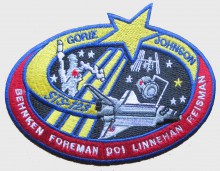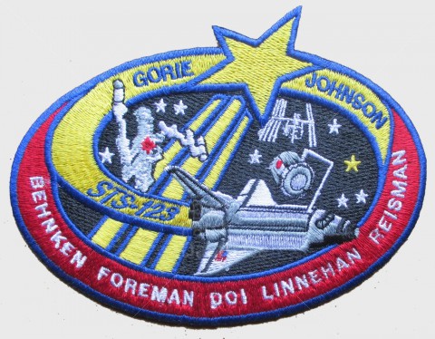 The crew patch depicts the space shuttle in orbit with the crew names trailing behind. STS-123's major additions to ISS (the ELM-PS installation with the shuttle robotic arm and the fully constructed SPDM) are both illustrated. The ISS is shown in the configuration that the STS-123 crew will encounter when they arrive.