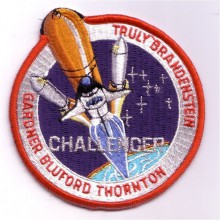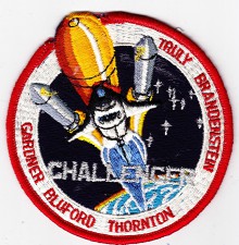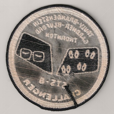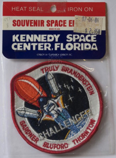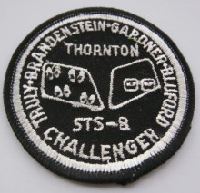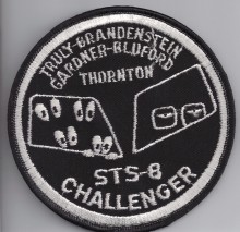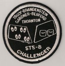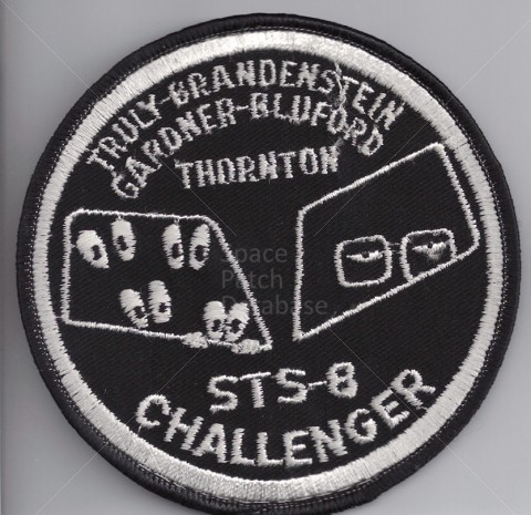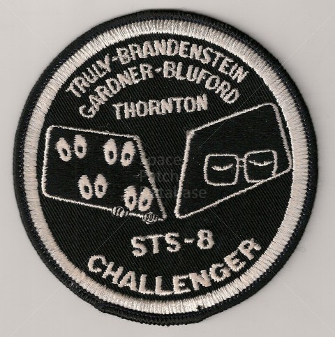 This patch was designed by STS-8 Pilot Dan Brandenstein. In the right window are Commander Richard Truly's eyes, behind spectacles, looking casually at things to come. Truly was the only veteran on board STS-8. The wonders of spaceflight might have seemed routine to him, having previously flown aboard STS-2. In the left window four pairs of wide open eyes can be seen gazing out. The eyes of the four rookies; Dan Brandenstein, Dale Gardnet, Guy Bluford and Bill Thornton. Beware of oor quality copies of this patch that are known to exist.