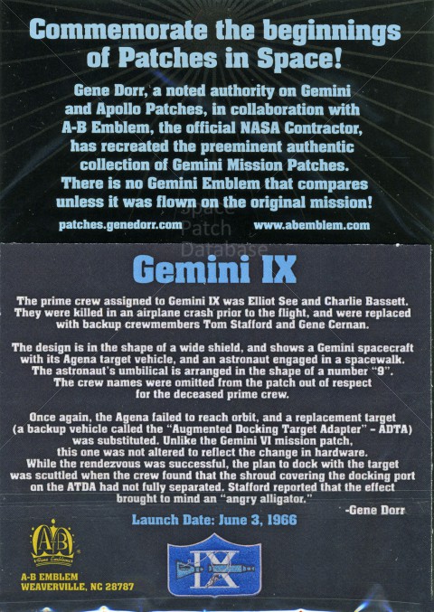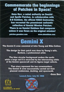 This page is to gather information linking a set of distinct Gemini crew patches to a single source. They are vintage, cheesecloth backed 3" patches. The eccentricies are easy to spot and often appear in matched lots. There is a set of Mercury and Apollo patches that often accompany them.