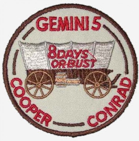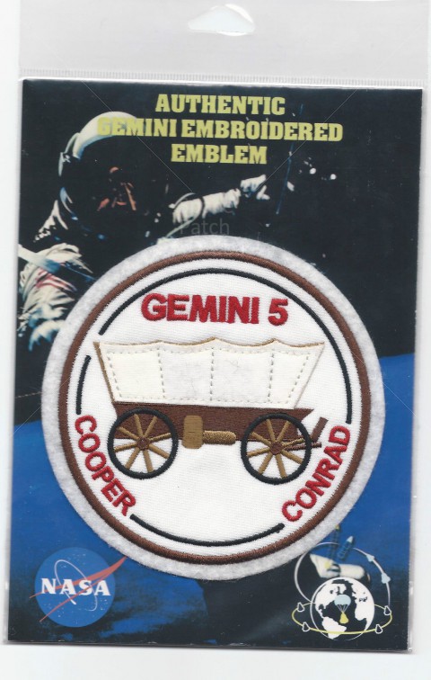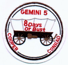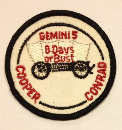 This is the crew-worn Gemini 5 patch. Notice it lacks the '8 days or bust' found on souvenir patches, because it was subsequently covered up by fabric.