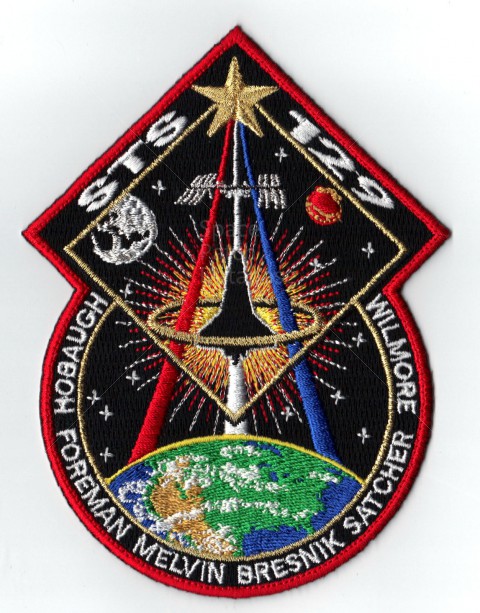 This version of the STS-129 patch has a merrowed edge, gold solar panels and has more elaborate stars.