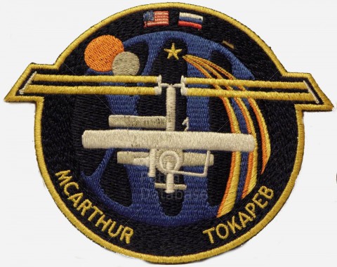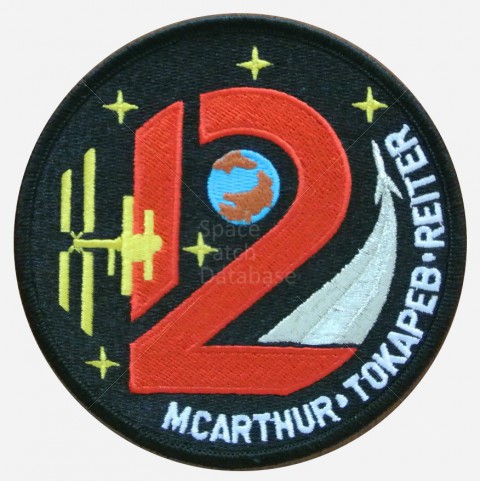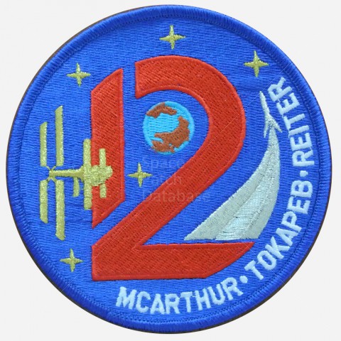 This version of the Expedition 12 patch was designed by Alex Panchenko. Two versions were made, black and blue for McArthur and Tokarev, respectfully. They feature the name of Thomas Reiter who was bumped to Expedition 13.