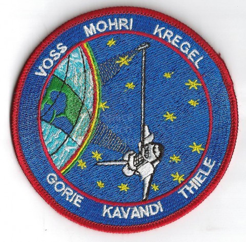 The five stars and shape of the robotic arm of the insignia symbolize the flight's numerical designation in the Space Transportation System's mission sequence.